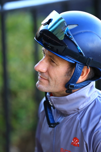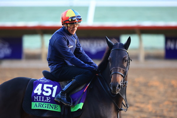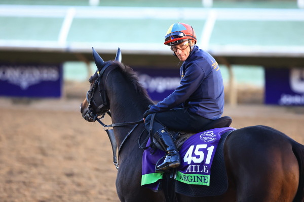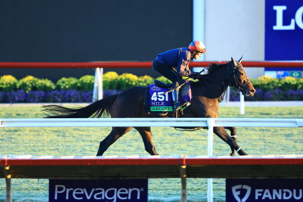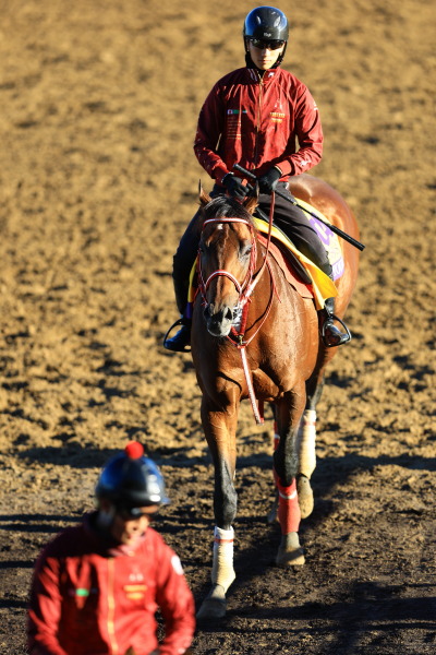 レースで騎乗するデットーリ騎手が跨って、芝コースで追い切られたブリーダーズカップマイルに出走するアルジーヌ(牝5歳 栗東・中内田 充正厩舎)