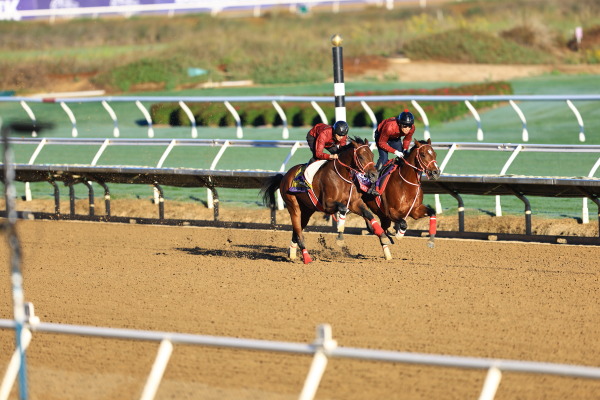ダートコースで併せ馬のクラシックに出走するフォーエバーヤング(牡4歳 栗東・矢作 芳人厩舎)とスプリントに出走するアメリカンステージ(牡3歳 栗東・矢作 芳人厩舎)