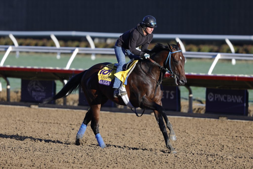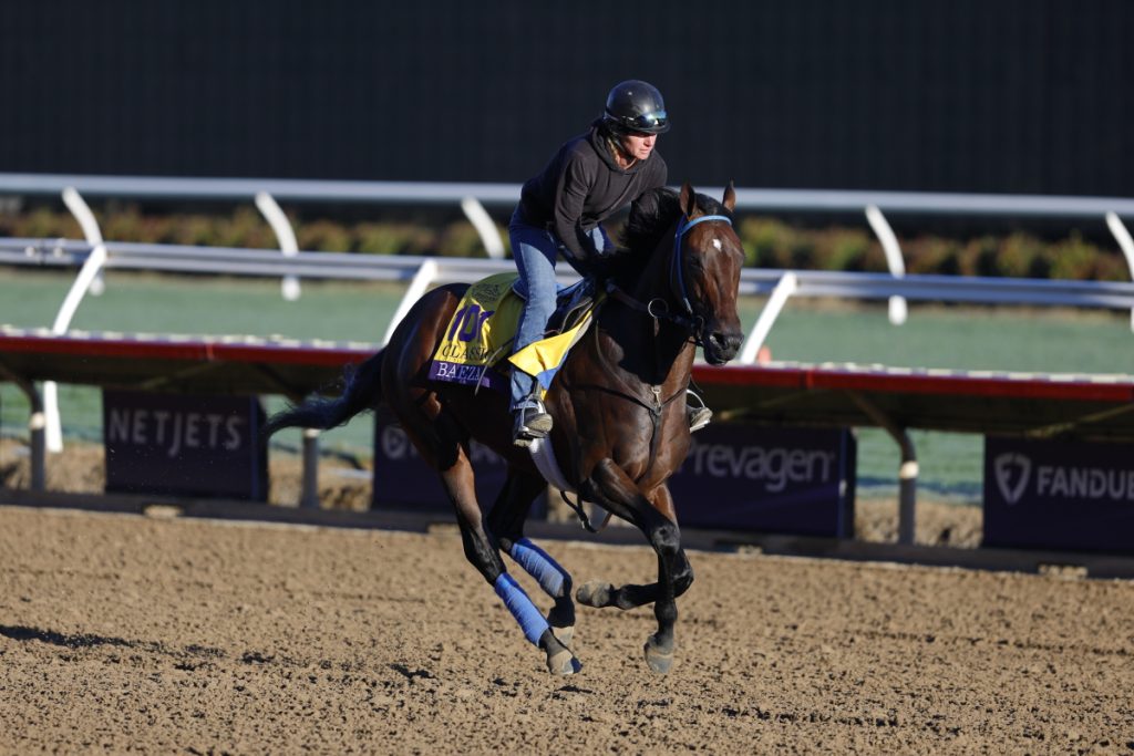 29日朝の調教中のバエザBaezaです。米ジョン・シレフスJohn Shirreffs師の管理する3歳牡馬で通算成績は8戦2勝、BCクラシックに出走します。昨年12月にデルマーDel Mar競馬場でデビューし、3戦目で初勝利を挙げました。今年4月のサンタアニタダービーSanta Anita Derby (Grade 1) でジャーナリズムJournalismに3/4馬身差の2着に入ると、ケンタッキーダービーKentucky Derby (Grade 1) でもソヴリンティSovereigntyに1-1/2、クビ差の3着に入りました。ベルモントSBelmont Stakes (Grade 1) は後方から追い込んでソブリンティに3、3-1/2馬身差の3着、サラトガSaratoga競馬場のジムダンディSJim Dandy Stakes (Grade 2) は直線でソヴリンティと激しく競り合って1馬身差の2着に入ると、前走のペンシルベニアダービーPennsylvania Derby (Grade 1) では後方2番手から捲って突き抜けマグニチュードMagnitudeに2-1/4馬身差を付けて初G1タイトルを獲得しました。レースでは前走で優勝に導いたヘクター・ベリオスHector Berrios騎手が騎乗します。