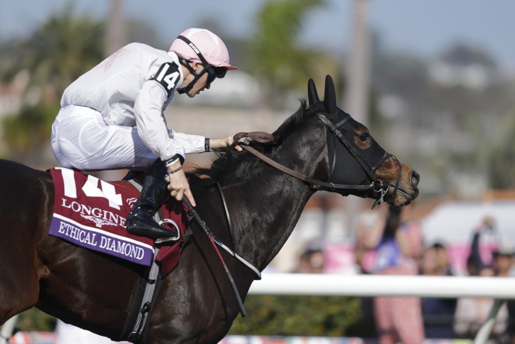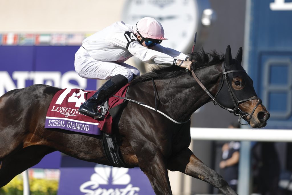 8Rに2400m芝のブリーダーズカップターフBreeders' Cup Turf (Grade 1) が行われました。シラウィSilawiがハナに立ち2番手にラシャバーRashabar、3番手に内からレベルスロマンスRebel's Romance、リディストリクティングRedistricting、ゴリアットGoliathが併走し、その外にミニーホークMinnie Hauk、中団の内にアミロクAmiloc、ウィンブルドンホークアイWimbledon Hawkeye、後方からエルコルドベスEl Cordobes、レベルレッドRebel Red、ヒルロードHill Road、トーニーポートTawny Port、3馬身離れてエシカルダイヤモンドEthical Diamond、最後方からゴールドフェニックスGold Phoenixという隊列になりました。向正面でゴリアットが2番手、3番手の内にレベルスロマンス、外にミニーホークとなり、4コーナーでゴリアットとミニーホークが先頭で競り合いながら直線へ。ミニーホークが単独で先頭に立ったものの残り200mで一杯となり、それをレベルスロマンスが交わしたものの、後方から直線で大外に持ち出したエシカルダイヤモンドが並ぶ間もなく差し切って優勝しました。勝ちタイムは2:25.45で鞍上はディラン・マクモナグルDylan McMonagle騎手。1-1/4馬身差の2着にレベルスロマンス、馬群の間を伸びたエルコルドベスが3/4馬身差の3着に入り、アミロクが1/2馬身差の4着、最後方から伸びたゴールドフェニックスが1-1/2馬身差の5着に入り、ミニーホークは1/2馬身差の6着、ゴリアットは11着でした。
