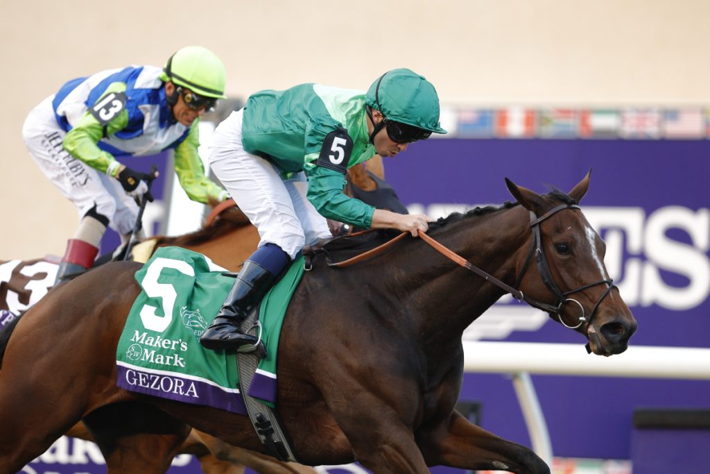 12Rに2200m芝のブリーダーズカップフィリー&メアターフBreeders' Cup Filly & Mare Turf (Grade 1) がアツィラAtsila取消の13頭立てで行われました。ビーユアベストBe Your Bestがハナに立ち、シーフィールズプリティShe Feels Prettyが2番手の外、3番手の内にヴィレッジボイスVillage Voiceが付け、カテドラルCathedral、シンデレラズドリームCinderella's Dreamが続き、中団の内にミッションオブジョイMission of Joy、ゲゾラGezora、その後ろにダイアモンドレインDiamond Rain、ベレッツァBellezza、後方からステラファイStellify、シーザファイアSee the Fire、ベッドタイムストーリーBedtime Story、離れた最後方からラキカLa Kikaという隊列となりました。向正面で逃げるビーユアベストは差を広げますが、4コーナーで2番手のシーフィールズプリティが先頭に立ち、ゲゾラ、シンデレラズドリームも差を詰めて直線へ。シーフィールズプリティが直線半ばまでリードを保っていましたが、ゲゾラが伸びてゴール前で交わして優勝しました。勝ちタイムは2:12.54で鞍上はミカエル・バルザローナMickael Barzalona騎手。1/2馬身差の2着にシーフィールズプリティ、直線でじわじわと伸びたダイアモンドレインが3/4馬身差の3着に入り、1/2馬身差の4着にカテドラル、1/2馬身差の5着にベッドタイムストーリー、シンデレラズドリームは直線で失速して8着でした。