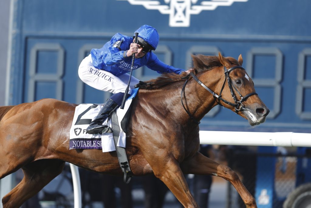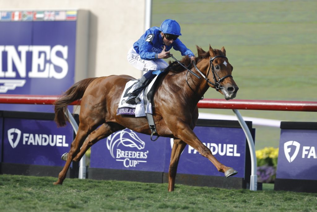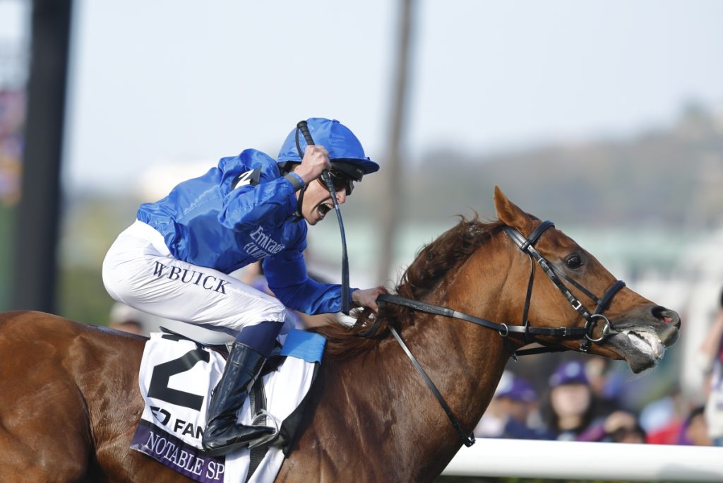 10Rに1600m芝のブリーダーズカップマイルBreeders' Cup Mile (Grade 1) が行われました。最内枠からワンストライプOne Stripeがハナに立ち、大外枠から出たキラートQiratが1コーナーの手前で並びかけての2番手、その後ろにザライオンインウィンターThe Lion in Winter、レトリカルRhetoricalが付け、3馬身離れて中団馬群の内にノータブルスピーチNotable Speech、外にヨハネスJohannes、フォーミダブルマンFormidable Man、後ろにサーランSahlan、ジョンキルJonquilと一団で進み、後ろにプログラムトレーディングProgram Trading、アルジーヌArgine、ガスミーアップGas Me Up、最後方からグランオリエンテGran Orienteという隊列になりました。3コーナーでレトリカルが逃げるワンストライプに並びかけ、その後ろからフォーミダブルマンも仕掛けて直線へ。レトリカルが単独先頭に立ったもののすぐに最内からノータブルスピーチが2番手に上がると、残り100mで内からレトリカルを交わしさって優勝しました。勝ちタイムは1:33.66で鞍上はウィリアム・ビュイックWilliam Buick騎手。外を伸びたフォーミダブルマンが1-1/2馬身差の2着に入り、先行グループで粘り込んだザライオンインウィンターがアタマ差の3着、レトリカルはゴール前で踏ん張れず1/2馬身差の4着、内を伸びたサーランがハナ差の5着に入り、直線を向いても後方馬群の中だったアルジーヌはゴール前で馬群の間を鋭く伸びたものの1馬身差の6着でした。