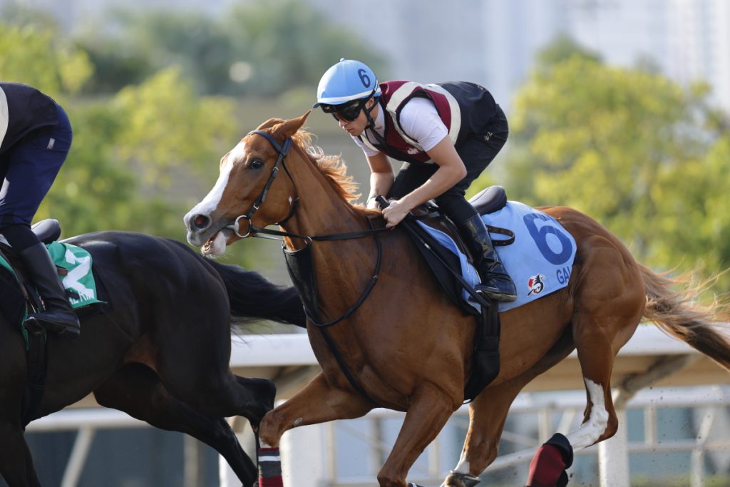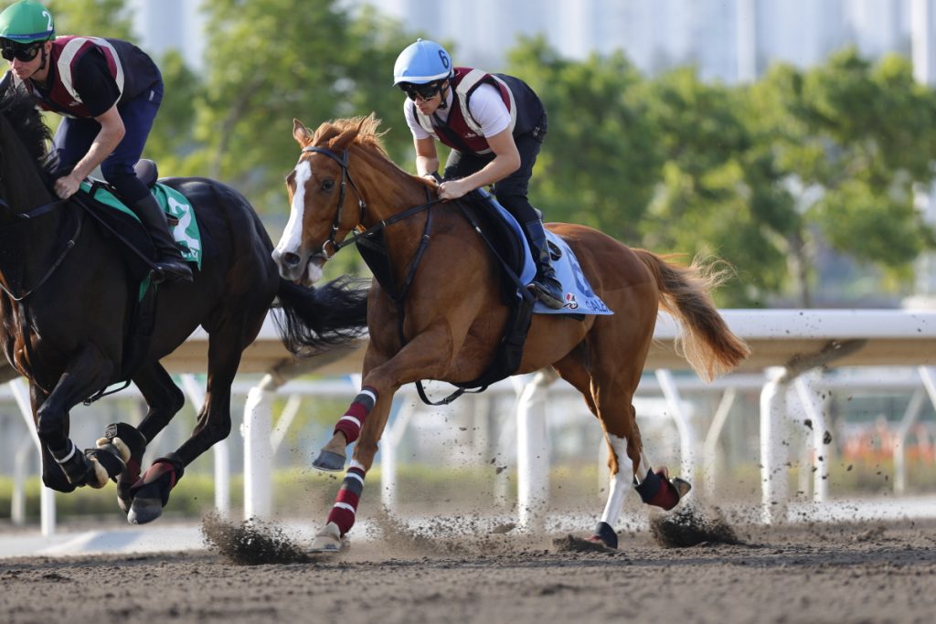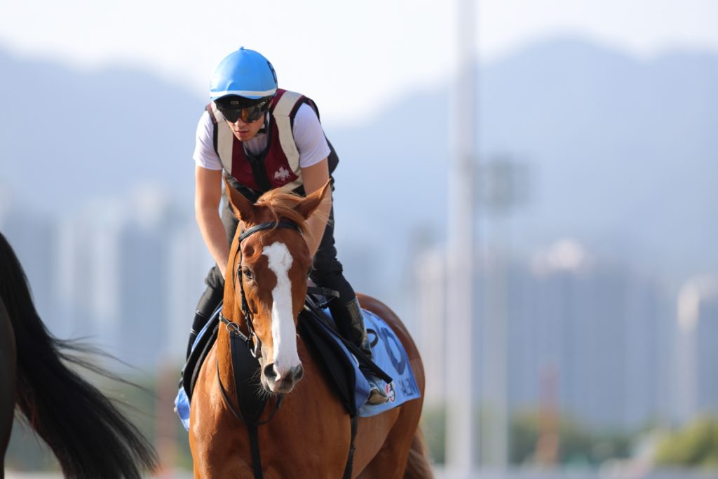 12日朝の調教中のガレンGalenです。愛ジョセフ・オブライエンJoseph O'Brien師の管理する4歳騸馬で通算成績は15戦3勝、香港カップに出走します。23年7月カラCurragh競馬場でのデビュー戦はシティオブトロイCity of Troyに2-1/2馬身差の2着で、24年6月の3戦目で初勝利を挙げました。9月にレパーズタウンLeopardstown競馬場のソロナウェイSSolonaway Stakes (Group 2) でディエゴヴェラスケスDiego Velazquezの8着に敗退し、その後去勢手術を受けました。今年に入りメイダンMeydan競馬場で3戦しましたが勝利はなく、4月にカラ競馬場のアレッジドSAlleged Stakes (Group 3) で初重賞勝利としましたが、その後は未勝利に終わっています。前走はバーレーンBahrainのバーレーンインターナショナルトロフィーBahrain International Trophy (Group 2)に参戦し、逃げて直線で突き放したもののゴール前でロイヤルチャンピオンRoyal Championに3/4馬身差交わされての2着でした。レースではディラン・マクモナグルDylan McMonagle騎手が騎乗します。