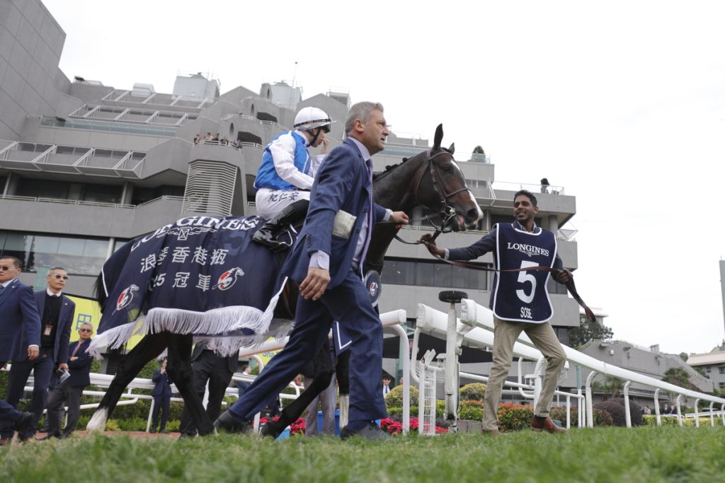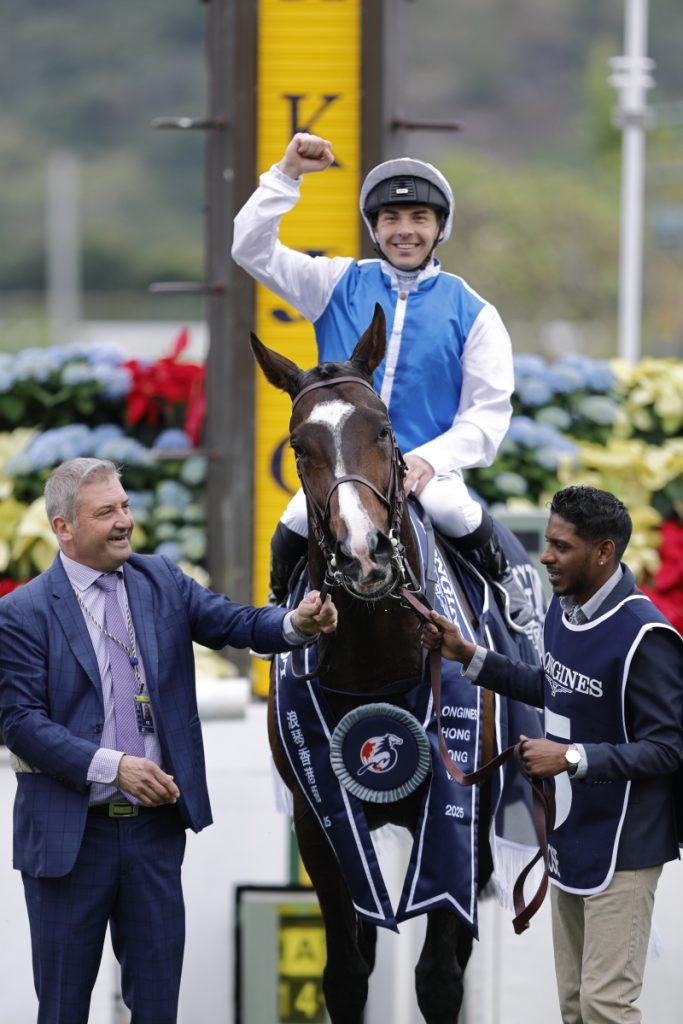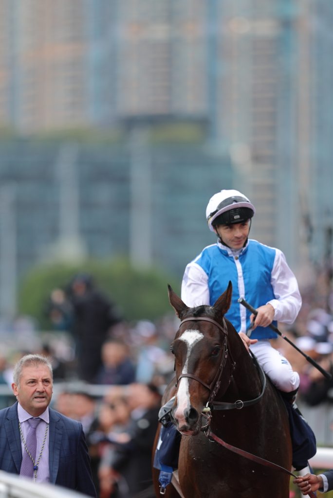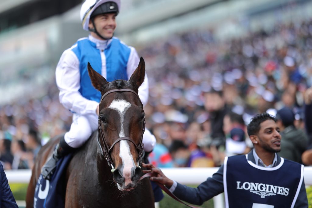 香港ヴァーズを優勝したソジーSosieです。スタート後に4番手に付け、3コーナーから仕掛けて差を詰めると、残り300mで抜け出して振り切り優勝しました。鞍上はマキシム・ギュイヨンMaxime Guyon騎手です。