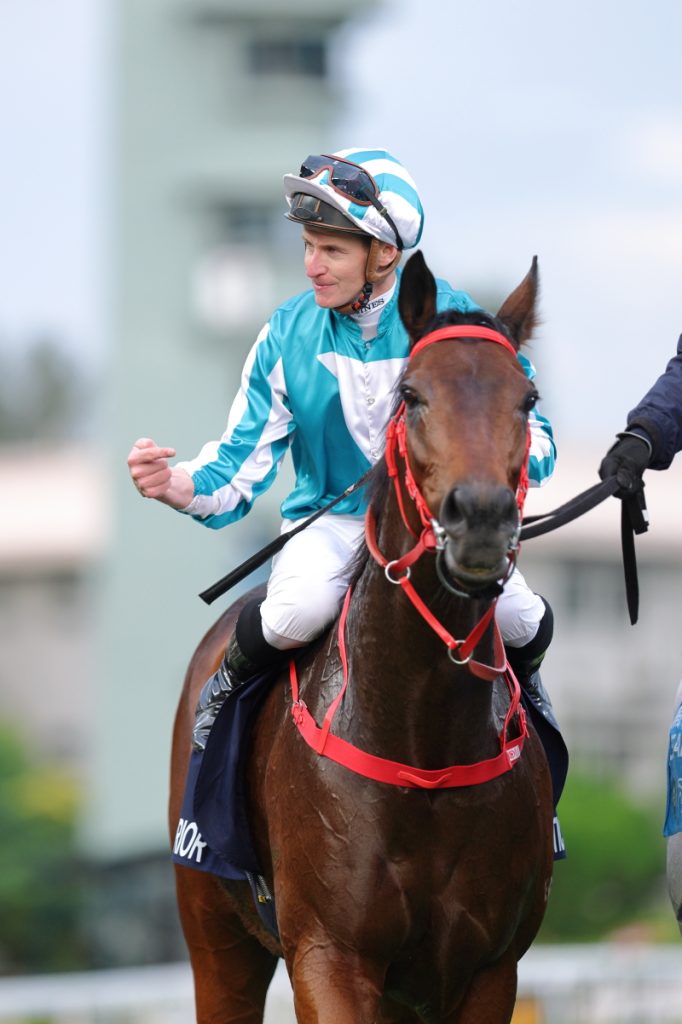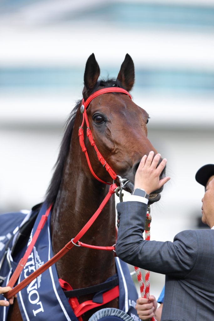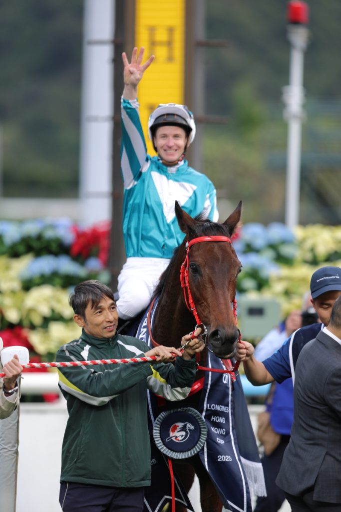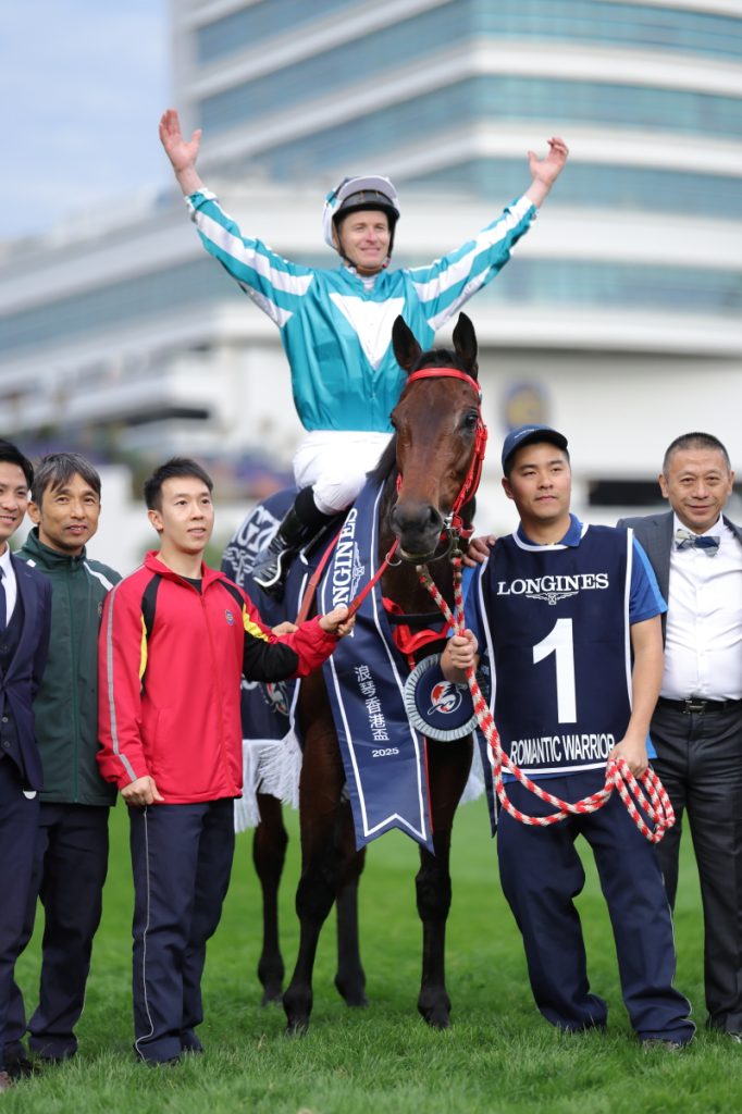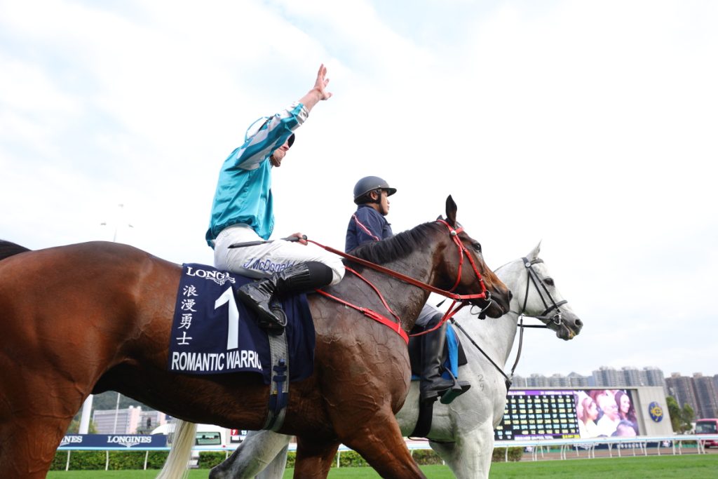 香港カップを優勝したロマンチックウォリアーRomantic Warriorです。好スタートから下げると3番手の外に付け、4コーナーで先頭に並びかけると残り250mで抜け出し、追いすがるベラジオオペラを寄せ付けず、香港カップ4連覇という偉業を達成しました。鞍上はジェームズ・マクドナルドJames McDonald騎手です。