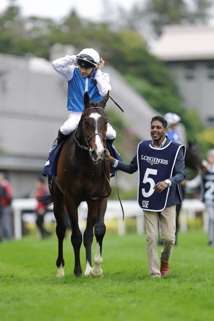 香港ヴァーズを優勝したソジーSosieです。スタート後に4番手に付け、3コーナーから仕掛けて差を詰めると、残り300mで抜け出して振り切り優勝しました。鞍上はマキシム・ギュイヨンMaxime Guyon騎手です。